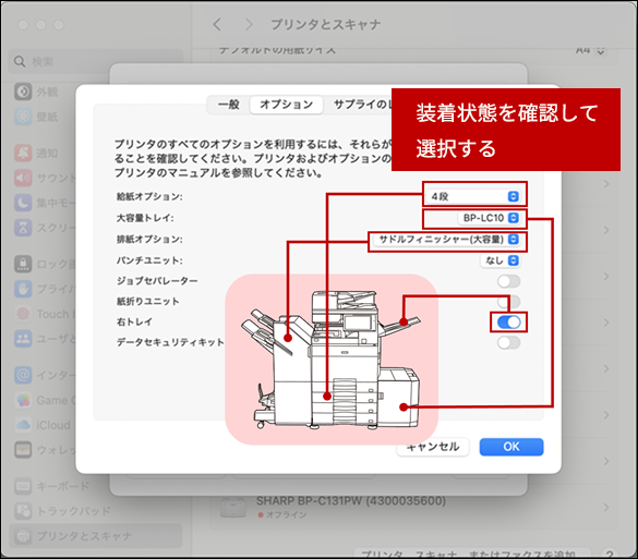 また、複合機に装着している給紙トレイやフィニッシャーなどが使えるよう、プリンタードライバーに設定をします。