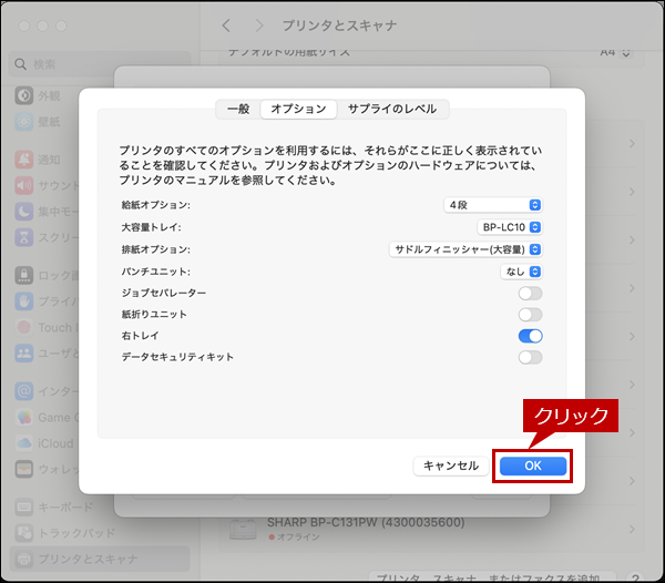 プリンター / プリンタードライバー / インストール / オプション / 自動設定 / 給紙トレイ / 設定 / システム設定 / Mac