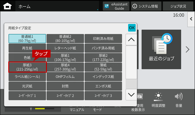 3.「用紙タイプ設定」画面が表示されますので、[厚紙3]をタップします。