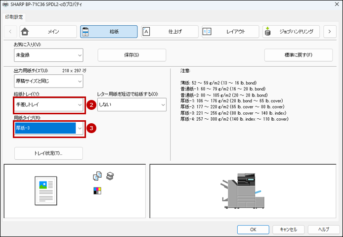 ③ 用紙タイプ(R):「厚紙ー3」