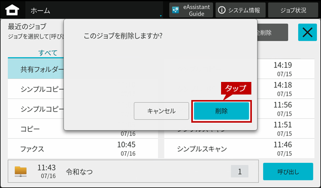 4. 「このジョブを削除しますか?」のダイアログ画面が表示されますので、[削除]をタップします。