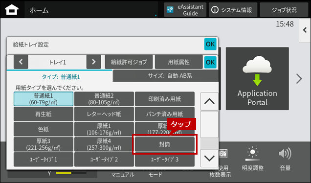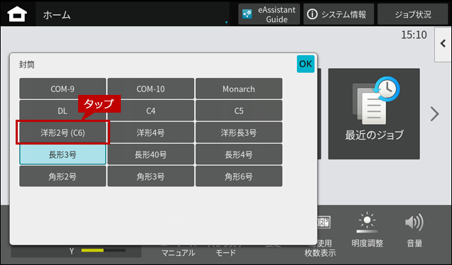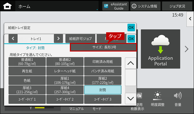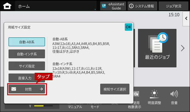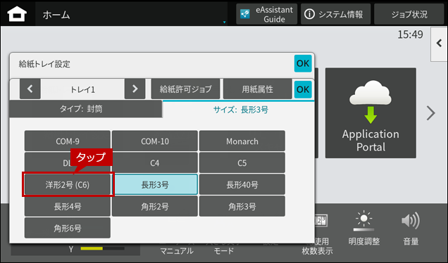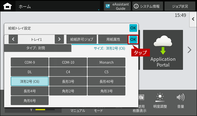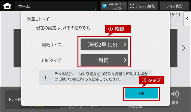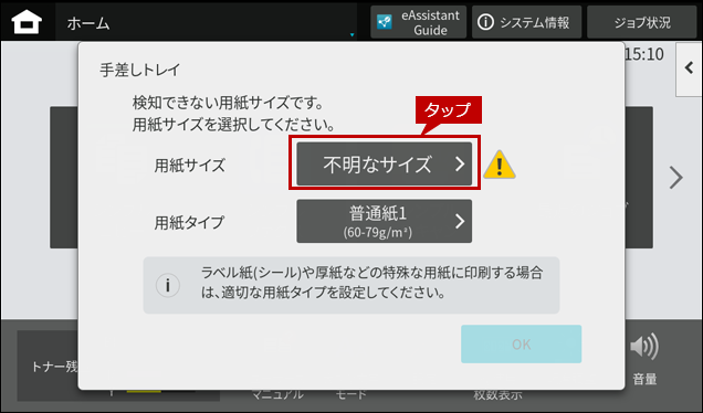 2. 封筒をセットしますとホーム画面に「手差しトレイ」の自動検知画面が表示されますので、「用紙サイズ」をタップします。