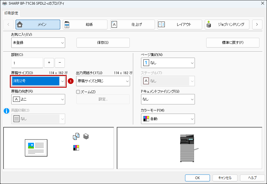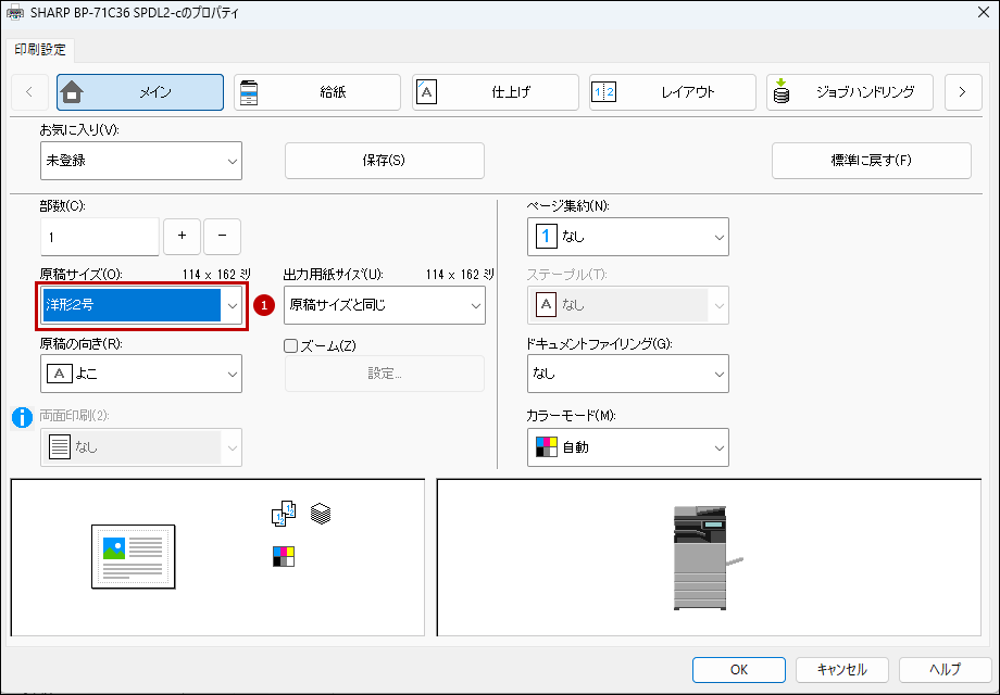 7.「プリンタードライバー」の設定画面で[メイン]タブを選択して、原稿サイズ(O)を設定します。