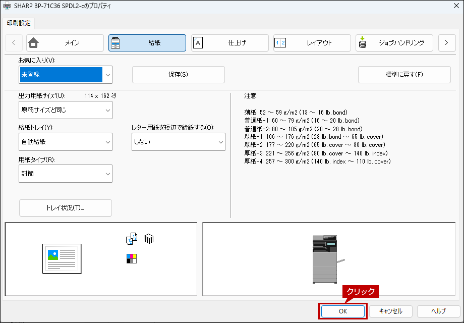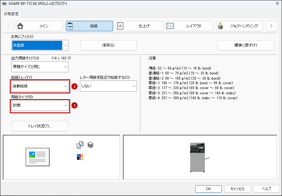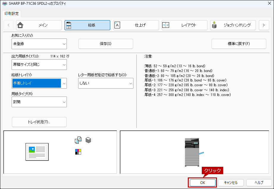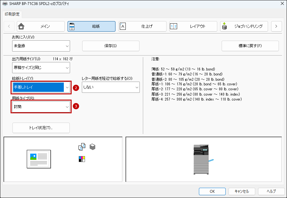 8. 次にプリンタードライバー設定画面で[給紙]タブをクリックし、給紙トレイと用紙タイプを設定します。