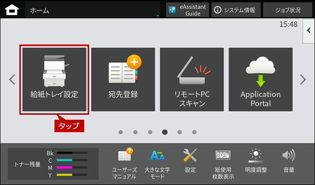 ※ [給紙トレイ設定]ボタンがトップページにない場合は、ホーム画面を右にスクロールします。