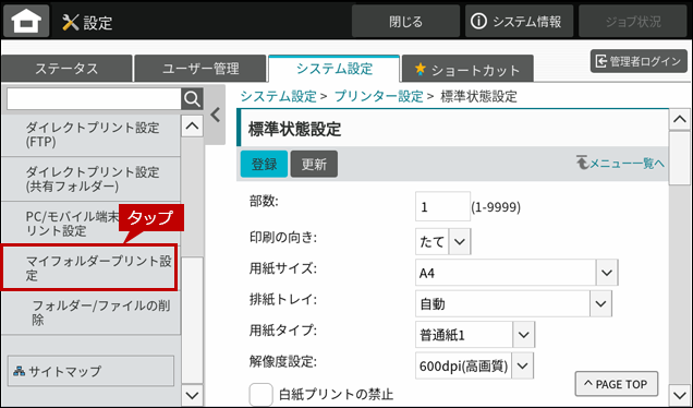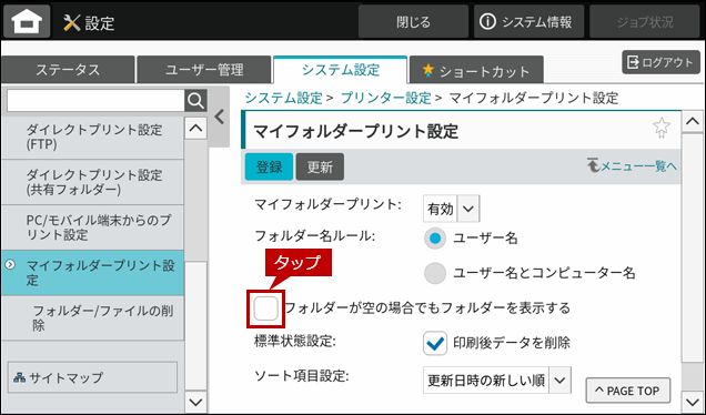 「マイフォルダープリント設定」の「フォルダーが空の場合でもフォルダーを表示する」を有効にすることで、フォルダーが空でもフォルダーを表示することができます。