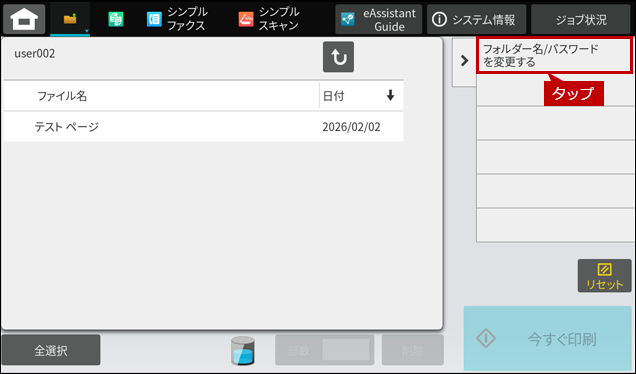 マイフォルダープリントのアクションパネルを開き、[フォルダー名/パスワードを変更する]からパスワードを設定することができます。詳しくは以下の操作ステップをご覧ください。