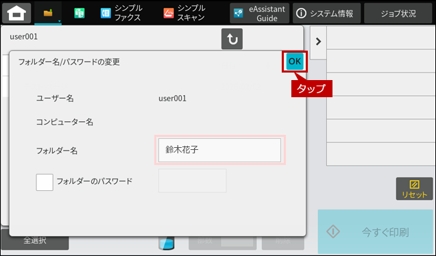6.「フォルダー名/パスワードの変更」画面にもどりますので、フォルダー名が変更されていることを確認して、[OK]をタップします。