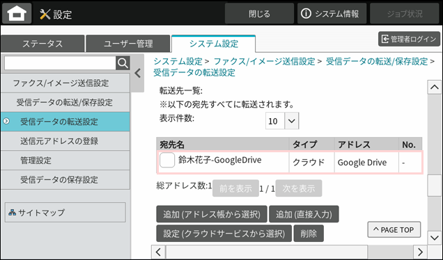 これで、ファクスの受信データの転送設定が完了しました。以降、ファクスの受信データは指定したクラウドストレージに転送されます。