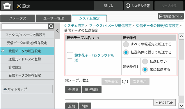13.「受信データの転送設定」画面が表示されますので、転送テーブルに登録した内容が表示されていることを確認します。