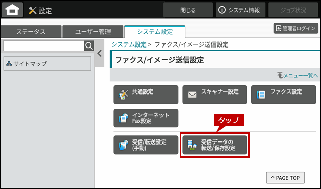 3.「ファクスイメージ/送信設定」画面が表示されますので、「受信データの転送/保存設定」をタップします。