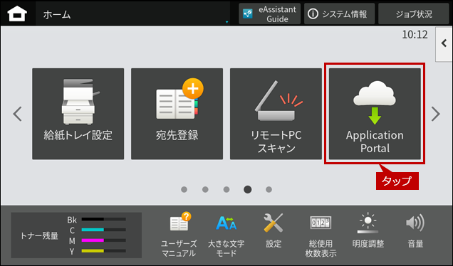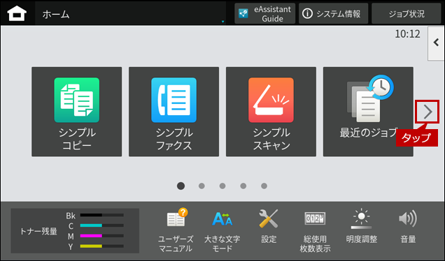9. ホーム画面が表示されますので、[>]をタップして画面を右にスクロールします。