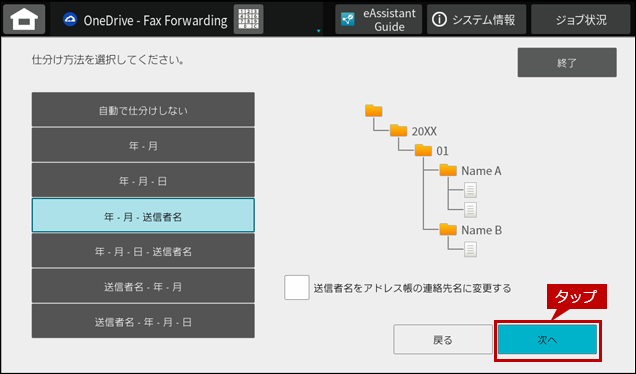 上記の例では、フォルダー構成が[年] >[月」 > [送信者名]となるフォルダーがOneDrive内に作成されます。