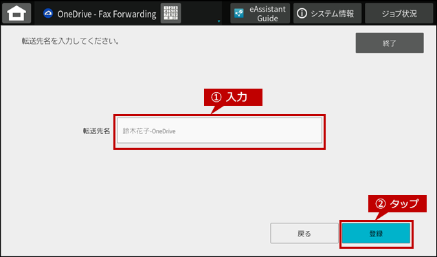 18.「転送先を入力してください」の画面が表示されますので、[転送先名]を入力後、[登録]をタップします。