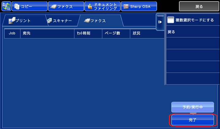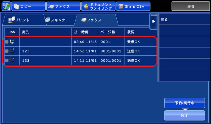 ③[完了]キーをタップし、ファクスの送受信の履歴が表示する