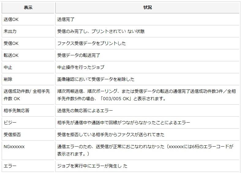 状況に表示される送受信の結果の説明については下記表をご覧ください。