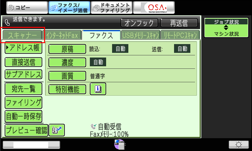 ③「ファクス/イメージ送信」画面が表示されますので、[スキャナー]タブを押してください。