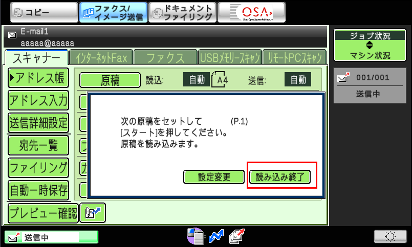 ⑧「次の原稿をセットして[スタート]を押してください。原稿を読み込みます。」が表示されますので、[読み込み終了]を押してください。