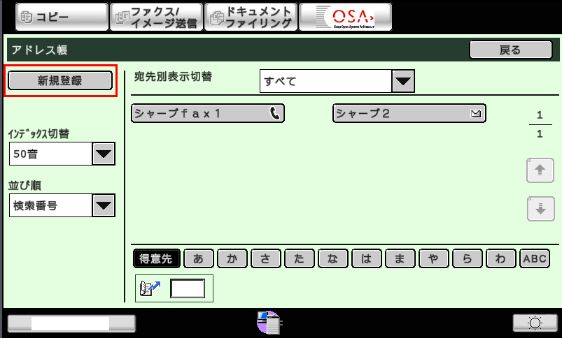 ⑤「アドレス帳」画面に戻りますので、登録した宛先が表示されていることを確認してください。