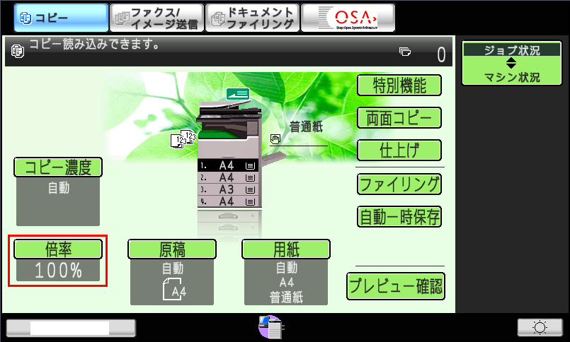 原稿サイズと用紙サイズが決まっている場合、最適な倍率を画面操作で選ぶことができます。また、用紙より少し小さくコピーするなどの微調整も可能です。※自動で拡大、縮小したい場合は■自動で原稿を拡大や縮小してコピーしたいのですが、どうすればよいですか?(倍率自動選択)を参照してください。
