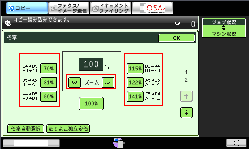 ③「倍率」画面が表示されますので、原稿サイズと用紙サイズに対応した倍率を選択し、[OK]を押してください。