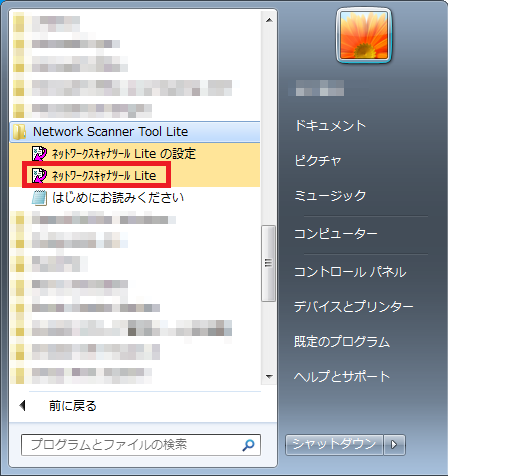 スタートボタン→[すべてのプログラム]→[Network Scanner Tool Lite]→[ネットワークスキャナツールLite]を押します。