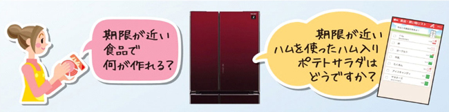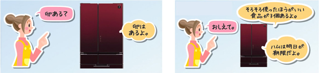 本機は、無線LANモジュールを内蔵し、音声認識機能を搭載することにより、冷蔵庫と対話しながら庫内の食品管理が簡単にできるようになりました。保存する食品を声で登録しておけば、使用期限が近づくと冷蔵庫が知らせてくれ、その食品を使ったメニューも提案してくれるので、食品を無駄なく使い切ることができます。冷蔵庫が音声で認識できる食品数は約1,650個、メニュー数は約220種類にものぼります。
