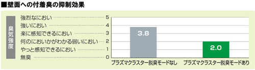 ※6 17Lのボックス内での実験結果。実使用空間での実証結果ではありません。使用環境(ニオイの種類や強さなど)により効果は異なります。【試験依頼先】(株)島津テクノリサーチ【試験成績書】KC-69068【試験方法】対象臭気(メチルメルカプタン)を満たした17Lのボックスに壁面材試料を投入。プラズマクラスター脱臭モードあり/なしで24時間後に取り出し、6段階臭気強度表示法により評価。【試験結果】プラズマクラスター脱臭モードなし:臭気強度3.8、プラズマクラスター脱臭モードあり:臭気強度2.0(パネラー平均値より算出)