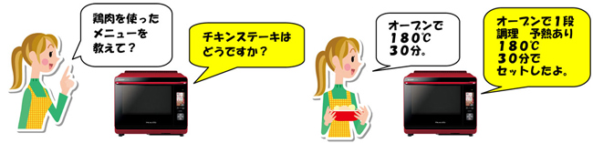 無線LANモジュールの内蔵と音声認識機能の搭載により、使いたい食材や料理のジャンルを本機に話すと、最適なメニューを提案してくれます。たとえば、「鶏肉を使ったメニューを教えて?」と話せば、「チキンステーキはどうですか?」と提案してくれるので、毎日の献立のメニューづくりに役立ちます。お好みのメニューが決まれば、自動調理データを本体にダウンロードして登録し、そのまま調理を開始できます。また、調理終了後にメニューの評価を音声対話で簡単に登録できます。お客様の間で評価の高いメニューは、「高評価メニュー」にてランキングの上位に表示します。