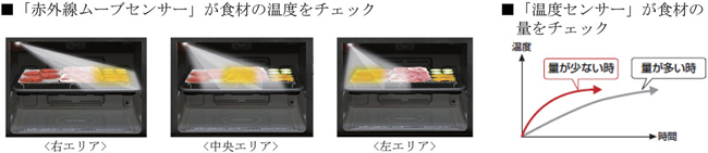 さらに、庫内天面に設置した「赤外線ムーブセンサー」が、右、中央、左のエリア別に食材の温度を検知することにより、食材の状態にあわせて過熱水蒸気の量をコントロールし加熱を開始します。加熱後、「温度センサー」が温度の上がり具合から、食材の量を検知。加熱時間を調整し、自動で仕上げます。