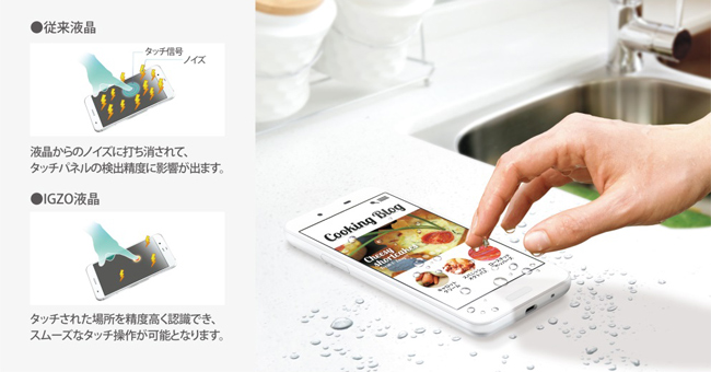 ・IGZO液晶ディスプレイの特長を生かした独自のタッチパネルチューニングにより、お風呂など画面や指が水に濡れていても誤動作が少なくスムーズに操作できます※4