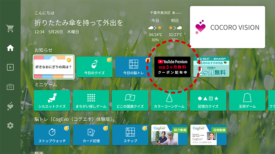 - ・クーポンは、「COCORO VISION」対応アクオス 1台につき1つの発行となります。複数のユーザーで共有できませんのであらかじめご了承ください。