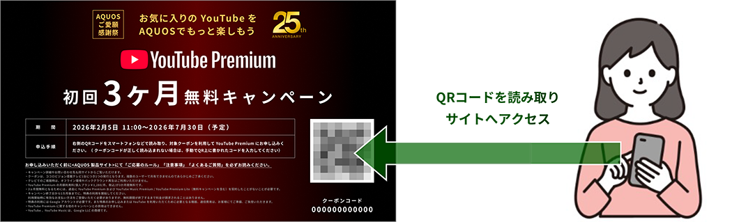| 特典 | 「 YouTube Premium 」の月額利用料(¥1,280/月 2026年2月時点)が3ヶ月間無料 例)2026年2月5日に「 YouTube Premium 」のお申し込みを完了した場合、お申し込み完了直後から3ヶ月後の2026年5月4日まで無料でご利用いただけます |