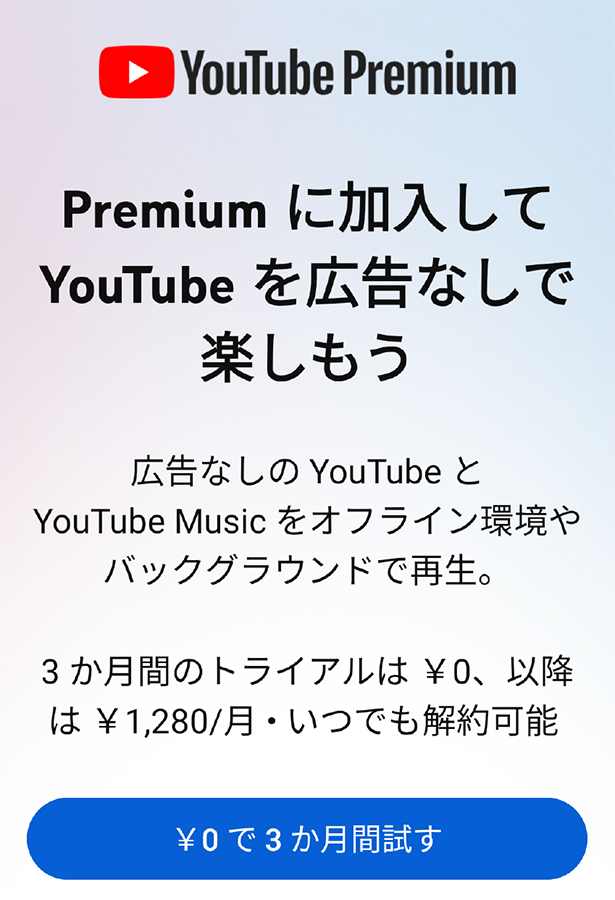 3ヶ月間無料となるためには、過去に YouTube Premium 及び YouTube Music Premium , YouTube Premium Lite (無料キャンペーンを含む)を契約したことがないことが必要です。 キャンペーン終了日から1ヶ月後までに、特典の利用を開始してください。利用開始時に有効なお支払い方法をご登録いただく必要がありますが、無料期間が終了するまで料金が請求されることはありません。 無料期間が終了すると、通常の定期購入料金(月額1,280円 2026年2月時点)が自動的に課金されます。終了する前であれば、いつでも無料でキャンセルできます。 特典の利用には Google アカウントが必要です。 「 YouTube 有料サービス利用規約」の全文はこちらからご確認ください( YouTube のサイトが開きます)。 |