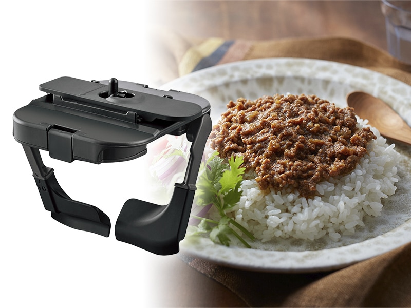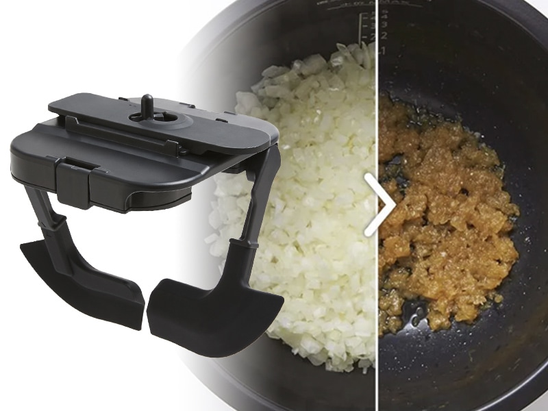 お手持ちのホットクックに取り付けできる別売品のまぜ技ユニットを発売。ゴムベラのような形状で専門店のような味わいを再現。従来のまぜ技ユニットでは難しかった、あめ色玉ねぎなどがほったらかしでできるようになりました。