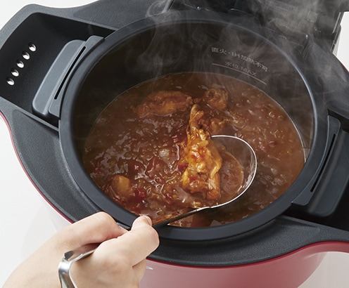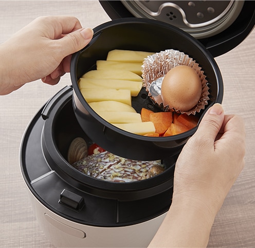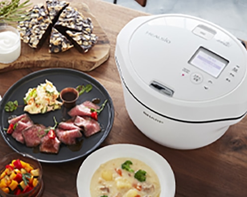 毎日使いを追求し、内鍋にフッ素塗装を採用しました。また、蒸し板を廃止して蒸しトレイを採用したことにより2段調理が可能に。低温調理機能が追加されたのも、この機種からです。