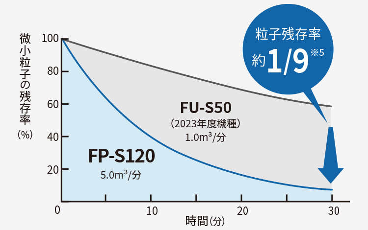 当社比。本検証は14畳の部屋における空気清浄機(2023年度機種FU-S50、FP-S120)の「自動」運転(最小風量)時でのシミュレーションです。実際の自動運転においては、微小粒子が多い時には風量を大きくし捕集率を上げる制御をしており、微小粒子をより早く集じんします。あくまでシミュレーションであり、実際の微小粒子を使って実証したわけではありません。実使用環境とは異なります。