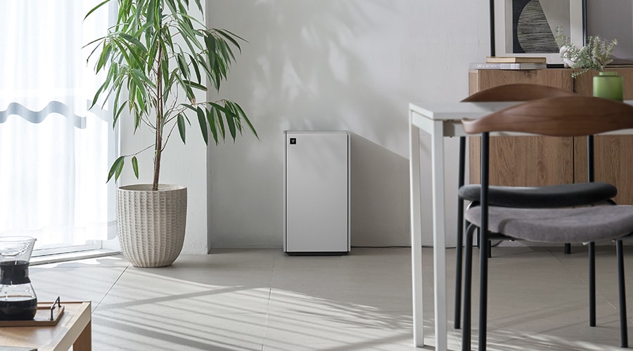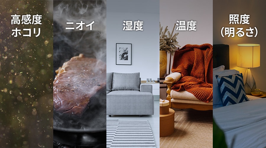 高感度ホコリ、ニオイ、湿度、温度、明るさの5つのセンサーを搭載。ホコリセンサーは、花粉などの大きな粒子に加え、0.5µmの微小な粒子まで検知します。