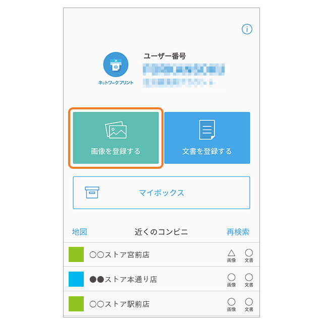 ネットワークプリントのアプリ画面から「画像を登録する」メニューをタップします。