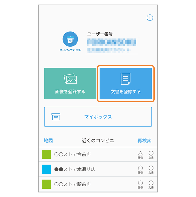 ネットワークプリントのアプリ画面から「文書を登録する」メニューをタップします。