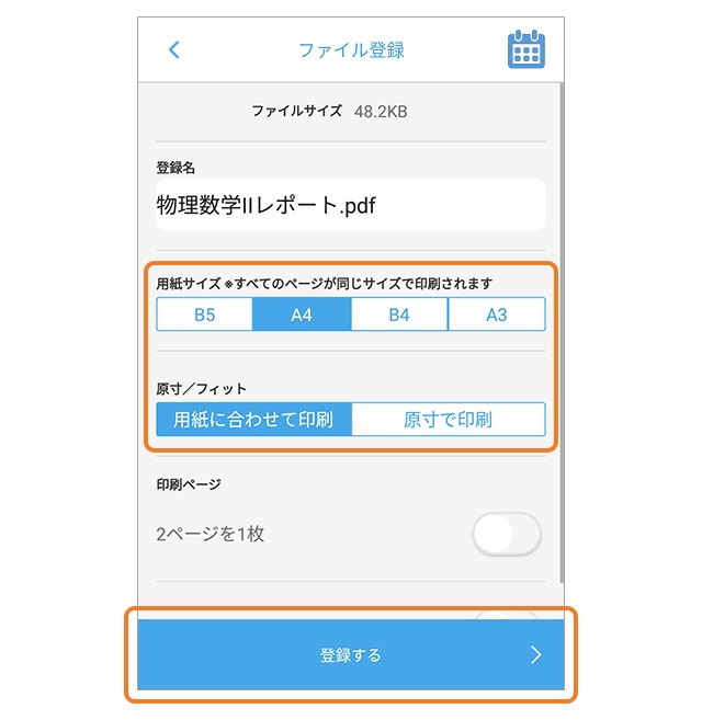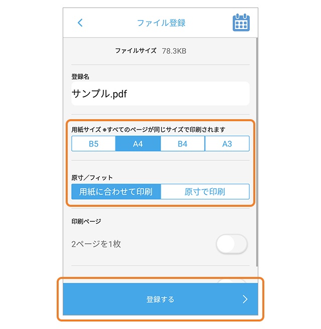 用紙サイズを選択し、「登録する」ボタンをタップします。