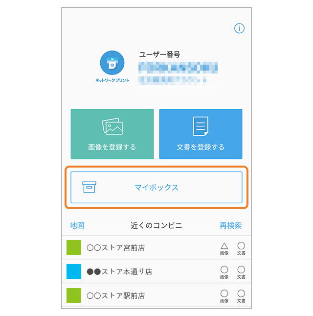 ネットワークプリントのアプリ画面から「マイボックス」をタップします。
