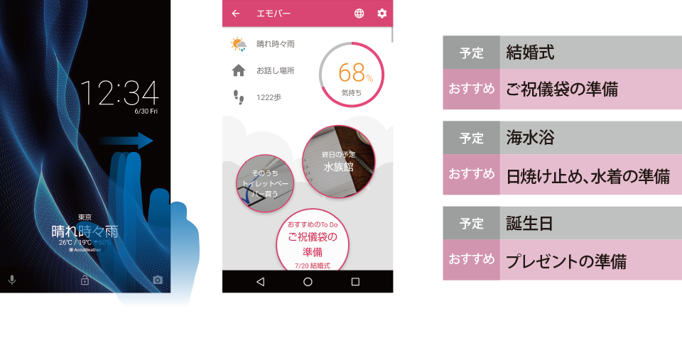 ロック画面をサッとスワイプすることで、今日の予定や天気などを簡単にチェックすることができます。さらに、あなたの予定に合わせて、エモパーをおすすめするTo Doもチェックできます。
