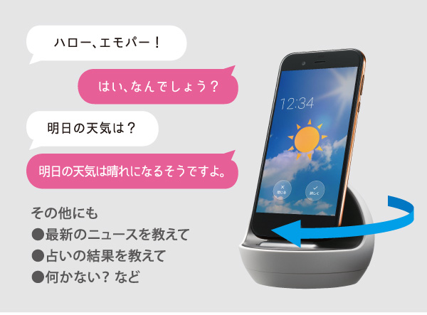 シーンに応じてお話ししてくれる情報を、いますぐ知りたいときは、「ハロー、エモパー」と声で呼び出して質問することができます。