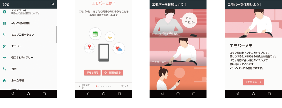 スマートフォンAQUOSの人工知能「エモパー」は、気になる明日の天気や、いま急上昇している検索ワードなど、タイミングよくシーンに合わせて話しかけてきます。ロボクルに挿して充電しているときはもちろん、自宅でスマホを机などに置いたときにも話しかけてきます。