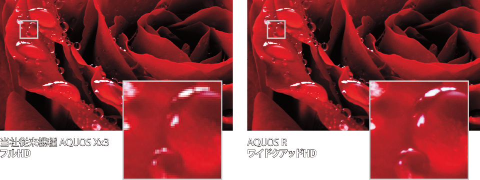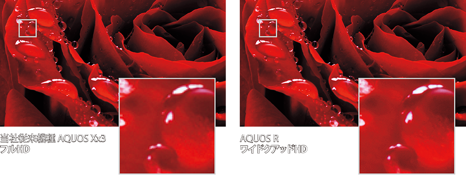 液晶テレビAQUOSの技術を受け継いだ「リッチカラーテクノロジーモバイル」を搭載。デジタルシネマの標準規格(DCI*1)に対応した広色域パネルと、豊かな色域を再現するカラーマッピング技術により、写真や動画を実物に近い色味で表示し、鮮やかに美しく再生できます。