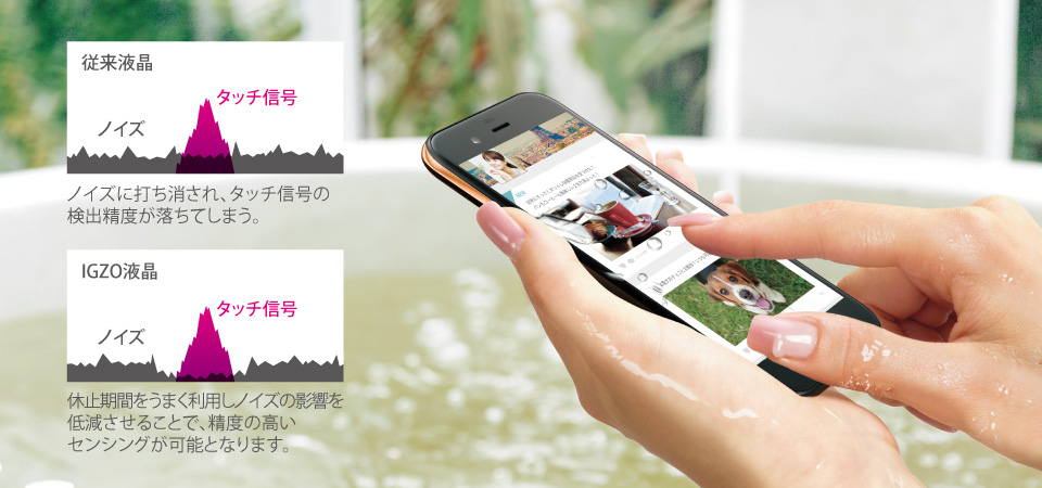 タッチ検出に悪影響をおよぼす、液晶からの電子ノイズが少ない駆動休止時間を利用して、微細なタッチをしっかり検出。さらに、徹底的な感度調整の最適化により、なめらかで気持ちよい操作感を実現しました。また、お風呂などで画面が水に濡れていても快適に操作できます。