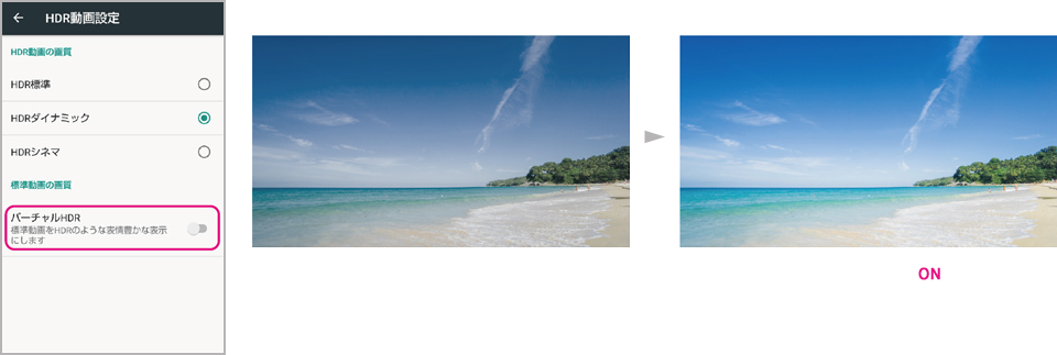 標準画質の動画コンテンツや自分で撮影した動画も、HDR画質のようなコントラストで楽しめます。