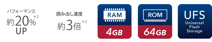 最新*1のQualcomm® Snapdragon™ 835(MSM8998)を搭載。オクタコア(2.2GHz×4コア+1.9GHz×4コア)CPUで、ハイパフォーマンスと省エネ性能を実現。高い処理能力が求められるゲームなども快適に楽しめます。4GBの大容量RAMと、ファイルシステムにUFSを採用した大容量64GBのROMを搭載し、読み出し速度が従来に比べ約3倍*2になり、アプリの起動や切り替えが高速でリッチなアプリでも快適に動作します。