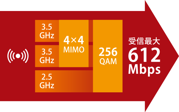 複数の異なる周波数帯を1つに束ねて大量のデータ通信を可能にする技術「キャリアアグリゲーション」に加え、機種と基地局にそれぞれ4本ずつのアンテナを使い複数のデータを同時に通信する技術「4×4 MIMO」、情報密度を高めて一度に運べるデータ量を増加させる技術「256QAM」により、さらに快適に高速通信を楽しむことができます。
